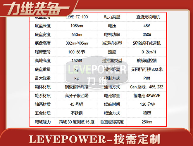 特種橡膠履帶底盤長1086mm,履帶底盤寬650mm,履帶底盤高382mm,無線遙履帶底盤搭載48V350W直流無刷永磁電機,RV50渦輪蝸桿減速機,動力更強。履帶底盤采用48V50AH鋰電池,續(xù)航時間更長。履帶底盤框架采用鋼板箱體焊接而成,底盤承載力大,是一款全地形履帶底盤。