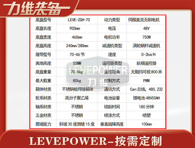 履帶底盤長900mm,履帶底盤寬460mm,履帶底盤高280mm,無線遙控履帶底盤箱體采用鋁合金材質(zhì)焊接而成,防腐性能好。履帶底盤動力采用48V750W直流無刷電機(jī),渦輪蝸桿減速機(jī)動力更強(qiáng),轉(zhuǎn)彎靈活。履帶底盤電池采用48V20AH鋰電池,續(xù)航時間更長,是一款不錯的機(jī)器人橡膠履帶。