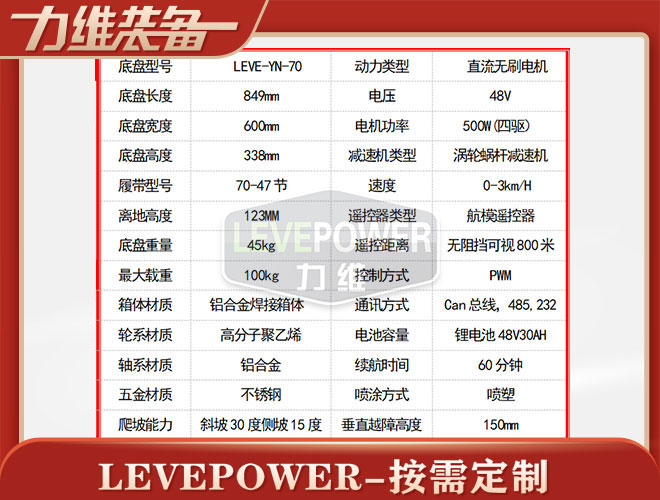 橡膠履帶底盤長849mm,履帶底盤寬600mm,履帶底盤高338mm,無線遙控履帶底盤搭載48V500W直流永磁無刷電機,RV渦輪蝸桿減速機動力更強,爬坡更有勁。