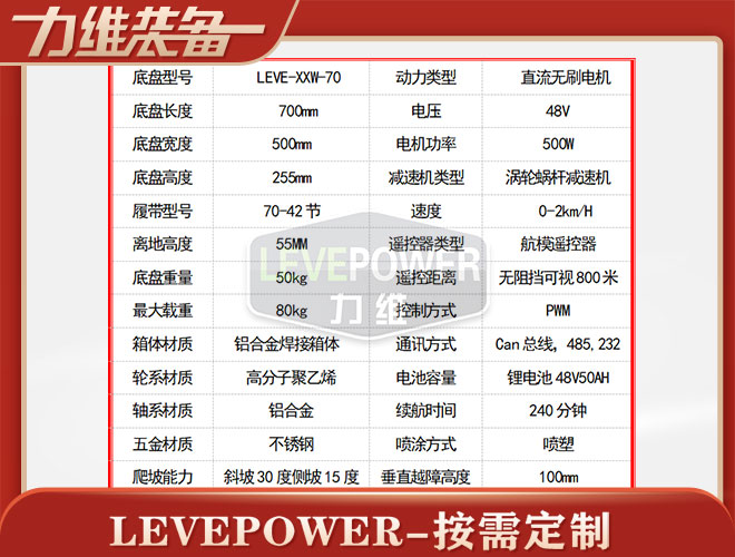 履帶底盤長700mm,履帶底盤寬500mm,履帶底盤高255mm,無線遙控履帶底盤箱體采用鋁合金材質焊接而成,防腐性能好。履帶底盤動力采用48V500W直流無刷電機,渦輪蝸桿減速機動力更強,轉彎靈活,爬坡性能穩(wěn)定。履帶底盤電池采用48V50AH鋰電池,續(xù)航時間更長,是一款不錯的機器人橡膠履帶。