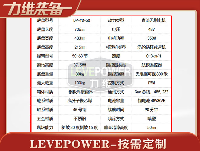 橡膠履帶底盤長706mm,橡膠履帶底盤寬483mm,橡膠履帶底盤高215mm,無線航模遙控履帶底盤采用48v350W直流無刷永磁電機,渦輪蝸桿減速機動力更強,轉彎靈活,操控簡單。履帶底盤電池采用48V30AH鋰電池續(xù)航時間更長。履帶底盤箱體采用鋼板焊接而成,輪系采用高分子聚乙烯,履帶底盤整體重量輕,耐磨性強。