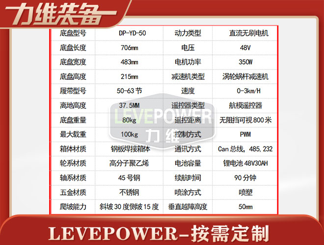 橡膠履帶底盤長700mm左右,履帶底盤寬340mm左右,履帶底盤高110mm左右,整車采用6061鋁合金箱體焊接,材質(zhì)輕,耐腐濁,履帶車搭載24v200W直流永磁無刷電機(jī),渦輪蝸桿減速機(jī),動(dòng)力強(qiáng),體積小,防水性能好,越野性能強(qiáng),可用于管道清淤,偵查、巡檢等場景。