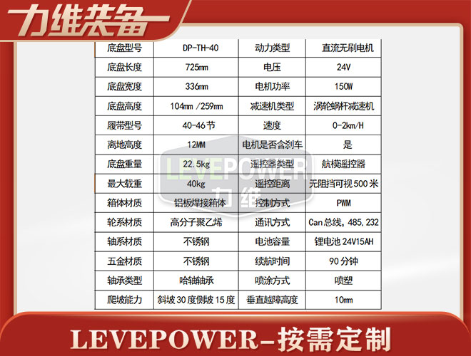 特種橡膠履帶盤使用寬40mm的耐磨橡膠履帶,底盤框架經(jīng)過高溫噴砂噴塑防銹處理,可載重200kg,是一種操控既方便,有實用的專業(yè)底盤系統(tǒng).合理的設(shè)計,越野性能更強。在不平坦的路面,爬坡,越障非常好用。是一款全地形底盤,行駛速度15千米每小時左右。